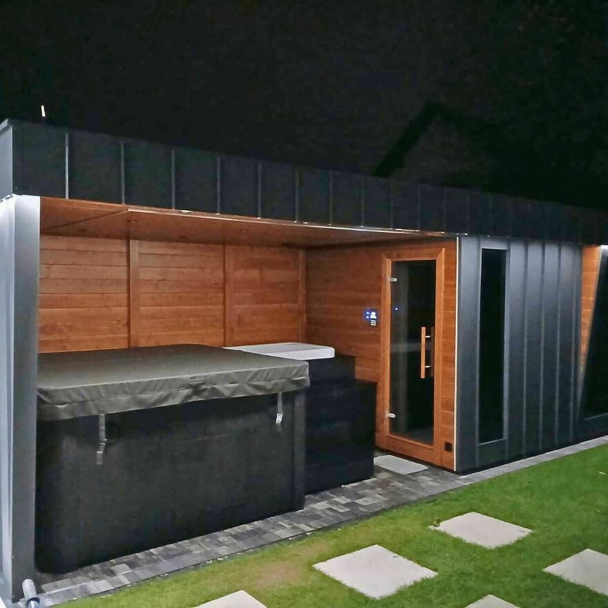 Domek SPA / Kompleks SPA 2,4 × 10 m — sauna fińska, jacuzzi, prysznic, WC, bania do morsowania.Produkt całoroczny, wykonany ręcznie przez polskiego producenta. Idealny do ogrodu, przy domu, pod wynajem, do pensjonatu lub strefy wellness.
